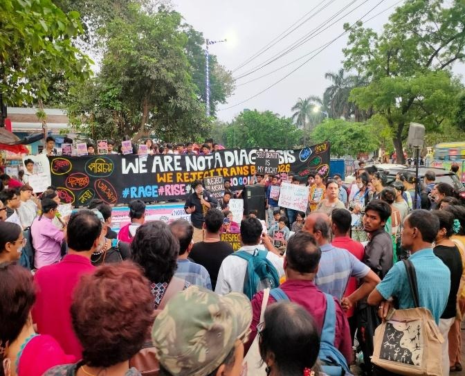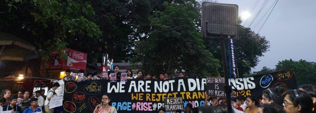 On 15th March, 2026, at a public event in Ranu Chhaya Mancha, Rabindra Sadan, a protest unfolded with slogans against the Transgender Rights Amendment Bill, alongside calls for alliance and unity among all groups fighting for equal rights and justice. Transgender activists, scholars, students, queer individuals from diverse backgrounds and professions, and allies concerned about transgender rights in India gathered around the elevated platform. The dangers of the new Act were reflected upon against the backdrop of the broader onslaught of violence and exclusion that transgender individuals already face in education, the workplace, the family, and the medical domain. A major point of contention was Section 18 of this Amendment that criminalised transgender individuals who, if proven to force or coerce a person to “become” transgender through forceful influence or surgical and hormonal procedures could be jailed for ten years. This comes in the backdrop of the fact that if a transgender person faces sexual abuse and violence, the perpetrator shall be jailed only up to two years. This insinuates something that is much grave than it seems – the government finds transgender people or queer rights groups helping out young transgender individuals accessing knowledge about gender affirmation as bigger criminals than someone perpetuating sexual violence against a transgender person. Open rejection of the Amendment and refusal to give up one’s dignity in proving one’s gender through a removal of clothes in front of a medical board, coloured the unified voices with multiple conversations intersecting the strategies that ought to be followed as a path to deal with the Amendment and reject it. “Do cisgender heterosexual people have to open their clothes, prove their gender in front of a medical board according to the size and shape of their genitals? If not, then why should we?” – exclaimed Anurag Maitreyee, a transgender and cultural rights activist on the microphone. “We are not your Diagnosis”, read a banner that stood tall among others, colouring the space in rage and solidarity. Larger conversations surrounding transgender lives in rural areas, intersected with lack of access to employment opportunities, education and healthcare in general, which is not just minimal, but in a regressive state, due to the absence of gender and sexuality sensitization in these spaces. Grieving voices intersected, while pondering upon the impact this Amendment can have on Dalit, Adivasi, Bahujan, rural and Muslim transgender people. In rural spaces where government hospitals hardly function to provide proper healthcare, one wonders how mandatory gender affirming care would even be provided, let alone form a medical board for a transgender person to “prove” their gender.
